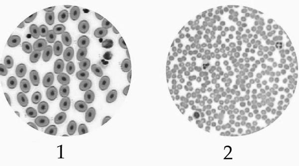 1) 1 — эритроциты лягушки, 2 — эритроциты человека;