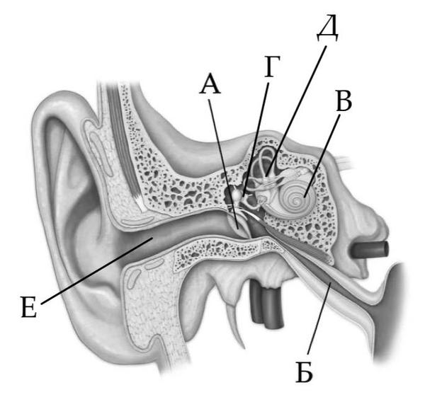 1) Д — орган равновесия (полукружные каналы); Б — слуховая труба (евстахиева труба);