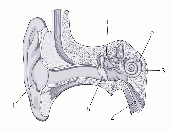 Какой цифрой на рисунке обозначена часть органа слуха, воспринимающая колебания воздуха?