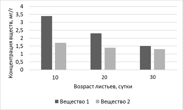 1) Концентрация веществ 1 и 2 в листьях уменьшается с возрастом.