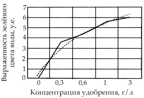 Экспериментатор решила установить, влияет ли наличие удобрений в водоёме на скорость зарастания воды зелёными водорослями. Для этого она отбирала воду из пруда рядом с домом, добавляла в неё различные концентрации удобрения и разливала по ёмкостям. По прошествии двух недель измерялась выраженность зелёного цвета воды в ёмкости («зелёность» измерялась в соответствии с условной шкалой). Результаты она нанесла на график.