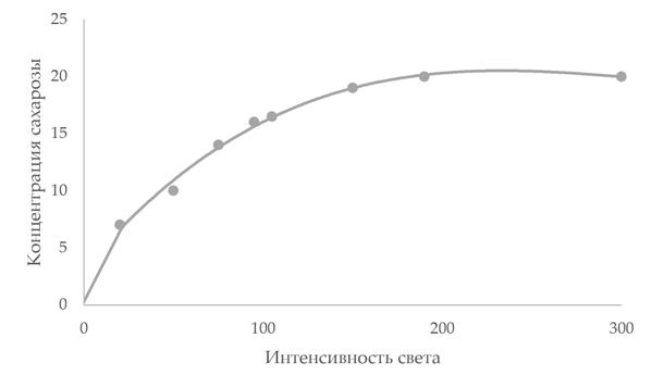 Экспериментатор решил установить зависимость концентрации сахарозы в соке флоэмы от условий произрастания растения. Для этого он разделил растения томата, выращиваемые в теплице, на 8 групп, каждую из которых поместил под источник света с определённой интенсивностью. Через некоторое время было измерено количество сахарозы в соке флоэмы для каждого растения. Результаты эксперимента учёный нанёс на график.