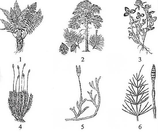 Каким номером на рисунке обозначено растение, у которого предназначенные для размножения клетки созревают в коробочке?