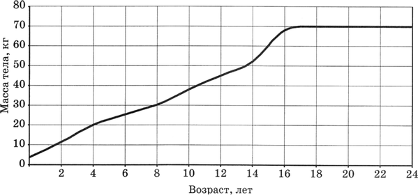 Проанализируйте график зависимости массы тела пациента от возраста в течении первых 24 лет.
