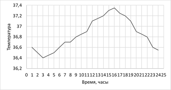 5) На протяжении суток есть два временных интервала, когда температура тела повышается из-за активности человека.