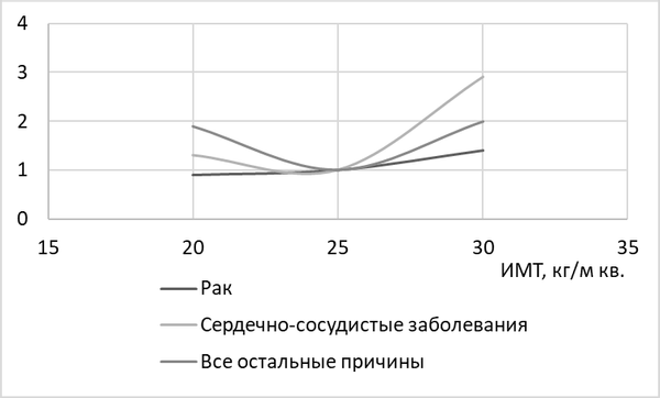 4) Риск гибели человека при указанных заболеваниях и ИМТ, равном 23-24, примерно одинаков.