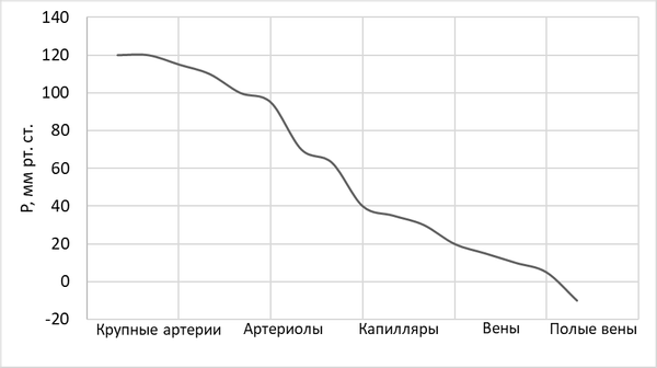 Проанализируйте график давления крови в различных сосудах кровеносной системы организма человека.