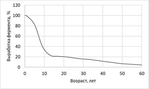 Проанализируйте график зависимости выработки фермента лактазы у людей от возраста. Лактаза — фермент, расщепляющий молочный сахар (лактозу).