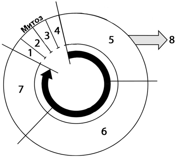 Каким номером на схеме обозначена стадия клеточного цикла, во время которой происходит удвоение ДНК.