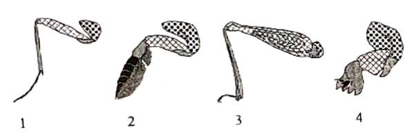 Какими цифрами на рисунке обозначены соответственно конечности прыгательная и копательная конечности насекомых? По каким признакам Вы отнесли их к соответствующим типам. Определите путь достижения биологического прогресса, в результате которого сформировались конечности таких типов. В чем он проявляется?