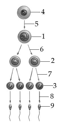 Установите соответствие между характеристиками и стадиями гаметогенеза, обозначенными на схеме выше цифрами 6, 7, 8: к каждой позиции, данной в первом столбце, подберите соответствующую позицию из второго столбца.
