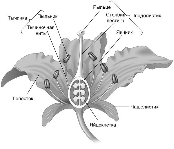 Назовите части цветка, обозначенные на рисунке цифрами 1, 7, 8, 10 и объясните их функции.