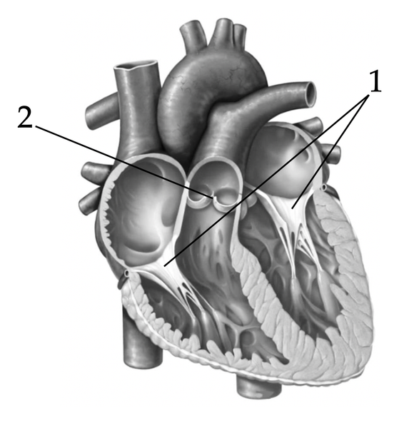 Назовите структуры сердца человека, обозначенные цифрами 1 и 2. Укажите их функции.