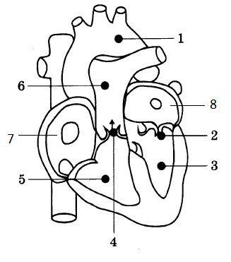 Элементы ответа: 1) в камеру, обозначенную цифрой 7 — правое предсердие, поступает венозная кровь из верхней и нижней полых вен; 2) в камеру, обозначенную цифрой 8 — левое предсердие, поступает артериальная кровь из легочных вен; 3) камера сердца 7 связана с большим кругом кровообращения; 4) камера сердца 8 связана с малым кругом кровообращения.