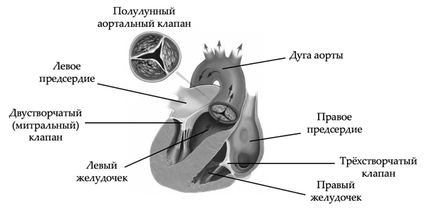 Элементы ответа: 1) полулунный (аортальный) клапан; 2) расположен на входе в аорту (на выходе из левого желудочка); 3) препятствует обратному току крови в левый желудочек (обеспечивает однонаправленный ток крови); 4) на границе правого желудочка и легочного ствола.