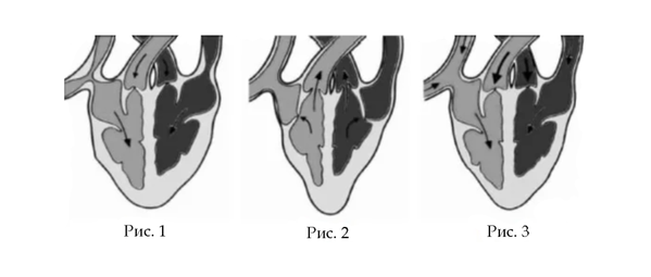 2) стрелки указывают на движение крови из желудочков (на рис. 2 объем желудочков минимален);