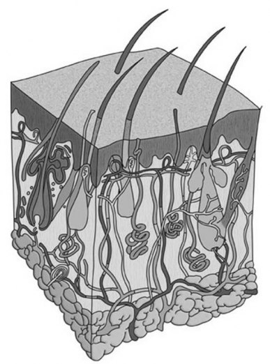 На рисунке изображено строение кожных покровов млекопитающих.