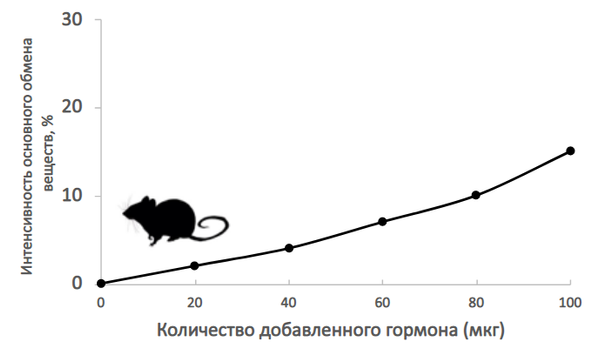 Экспериментатор решил изучить интенсивность основного обмена веществ у домовой мыши (Mus musculus). Для этого он вводил в брюшную полость мышам разные дозы гормона щитовидной железы в физиологическом растворе. Результаты эксперимента представлены на графике.