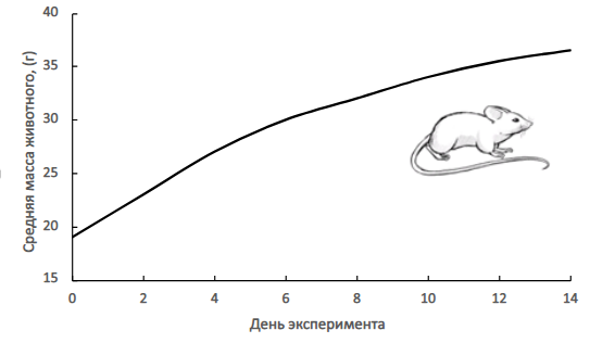 Ученый провел эксперимент со взрослыми домовыми мышами (Mus musculus). Для этого он кормил их в течение 14 дней пищей, соленость которой превышала нормальную в 1,2 раза. В течение всего периода наблюдения он измерял массу тела мышей. Полученные данные представлены на графике.