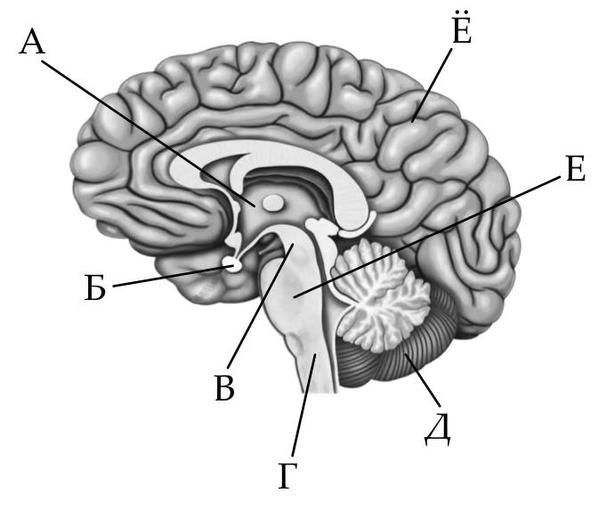 Назовите отделы головного мозга, обозначенные на рисунке буквами В и Д. Опишите особенности их строения и функции.