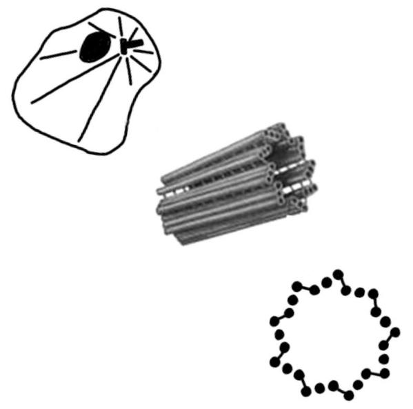 3) стенка центриоли состоит из 9 триплетов тубулиновых микротрубочек, триплеты центриолей соединены между собой связками.