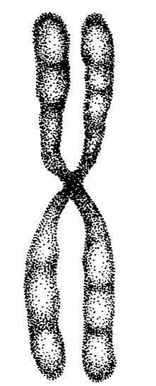 Изображена хромосома — они состоят из 2 сестринских хроматид (удвоенных молекул ДНК), соединенных друг с другом в области первичной перетяжки — центромеры;