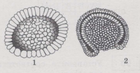 Установите соответствие между характеристиками и стадиями развития зародыша, обозначенными на рисунке цифрами 1 и 2.