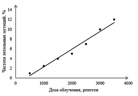 Экспериментатор решил изучить влияние рентгеновского излучения на организм дрозофилы. Для этого он облучал популяции из 1000 мух разными дозами рентгеновского излучения. Результаты эксперимента показаны на графике.