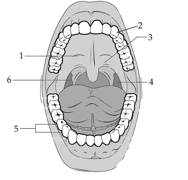 Выберите три верно обозначенные подписи к рисунку, на котором изображено строение ротовой полости. Запишите в таблицу цифры, под которыми они указаны.