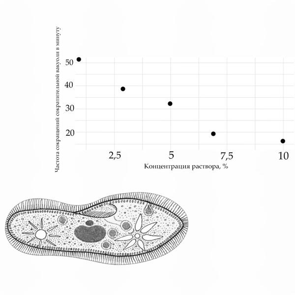 Экспериментатор решил установить зависимость частоты сокращения сократительной вакуоли инфузории туфельки (Paramecium caudatum) в зависимости от концентрации солей во внеклеточной среде. Для этого культуру инфузорий, выращиваемую в нефильтрованной воде помещали в растворы с концентрацией поваренной соли 3%, 5%, 7%, 10%. Результаты эксперимента представлены в таблице и на графике.