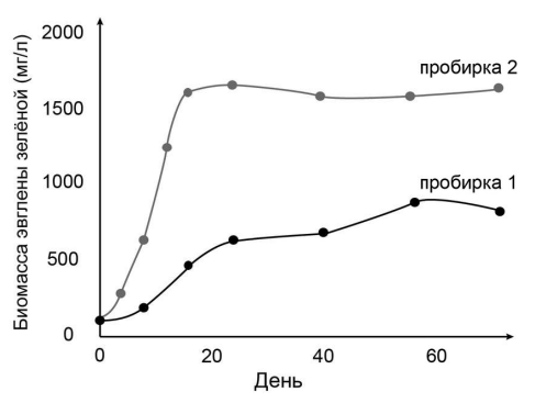 Учёный провёл эксперимент с эвгленой зелёной. Для этого он приготовил жидкую среду для их культивирования, в состав которой входили глюкоза, аминокислоты и другие необходимые для жизнедеятельности организмов вещества. В две пробирки он поместил одинаковое количество эвглен из одной материнской культуры. Одна пробирка круглосуточно освещалась. Другую пробирку он поместил в условия полного отсутствия света. Обе культуры находились в стерильных условиях и с доступом атмосферного воздуха. Затем в течение нескольких месяцев учёный измерял биомассу эвглен в двух пробирках. Результаты измерений приведены на графике.