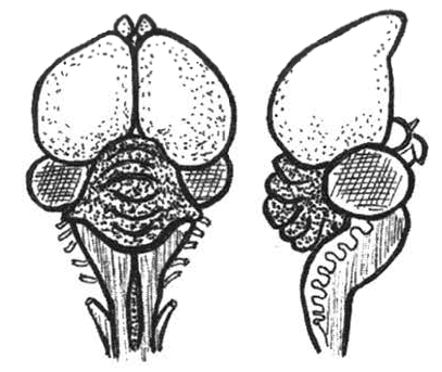 Выберите три верных ответа из шести и запишите в таблицу цифры, под которыми они указаны. Если в процессе эволюции у животного сформировался головной мозг, изображенный на рисунке, то для этого животного характерны