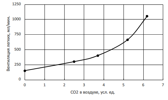Экспериментатор провёл эксперимент на курах для изучения регуляции дыхания. Для этого он помещал птиц в герметичную камеру, где менял концентрацию углекислого газа в подаваемом воздухе. Результаты эксперимента представлены на графике.