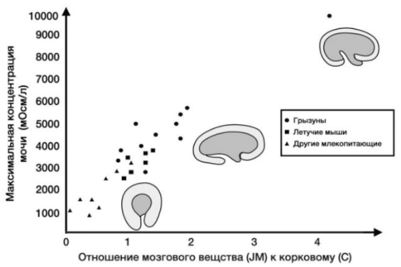 4) увеличенное соотношение мозгового вещества к корковому означает увеличение длины петли Генле (извитого канальца) в нефроне и увеличение интенсивности реабсорбции;