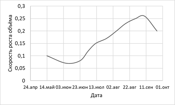 Проанализируйте график изменения скорости роста объема муравейника в мае-сентябре.