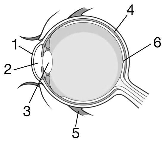 Выберите три верно обозначенные подписи к рисунку, на котором изображён глаз человека. Запишите в таблицу цифры, под которыми они указаны.