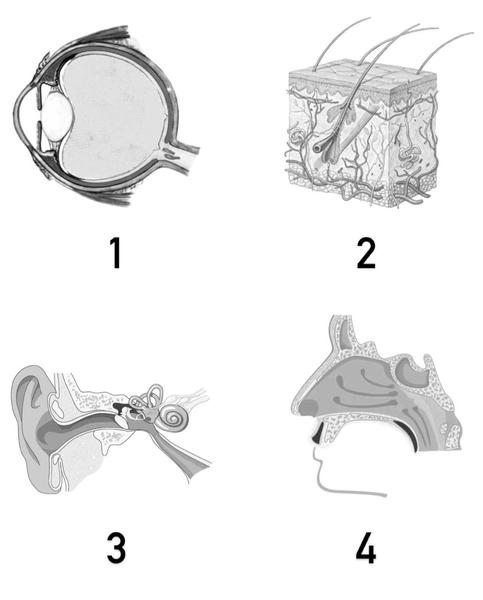 1) Глаз (периферический отдел зрительной сенсорной системы); 2) Кожа (периферический отдел соматосенсорного (тактильного) анализатора, представленный механорецепторами, терморецепторами и др); 3) Ухо (периферический отдел слухового анализатора); 4) Нос (периферический отдел обонятельного анализатора находится в верхнем носовом ходе).