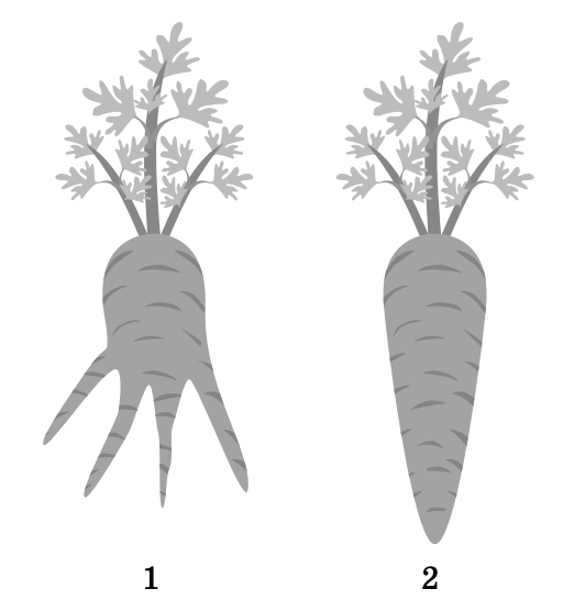 Рассмотрите рисунки 1, 2 с изображением видоизменения корня растения. Как называют данное видоизменение корня? Какой агротехнический приём необходимо использовать человеку для снижения вероятности деформации моркови, изображённой на рисунке 1?