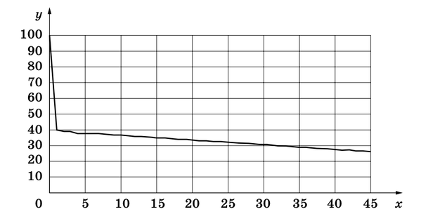 Изучите график зависимости сохранившейся в памяти информации от времени, прошедшего с момента её получения (по оси х отложено время (ч), а по оси у — доля сохранившейся в памяти информации (%)).