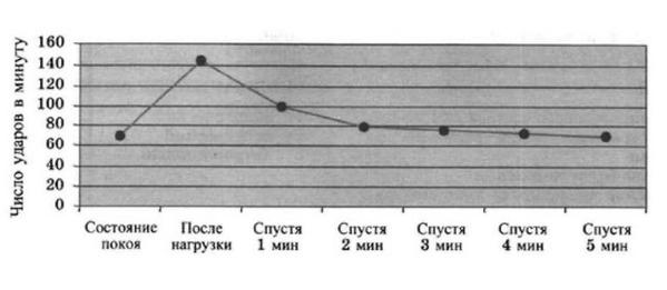 2) Спустя 5 минут после нагрузки число ударов сердца в минуту возвращается к числу в состоянии покоя.