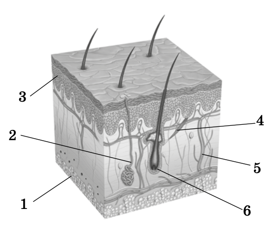 Выберите три верно обозначенные подписи к рисунку, на котором изображена кожа человека. Запишите в таблицу цифры, под которыми они указаны.