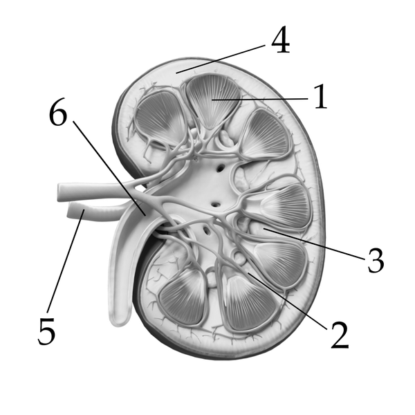 Выберите три верно обозначенные подписи к рисунку, на котором изображена почка человека. Запишите в таблицу цифры, под которыми они указаны.