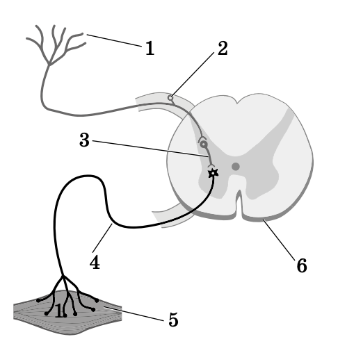Выберите три верно обозначенные подписи к рисунку, на котором изображена рефлекторная дуга человека. Запишите в таблицу цифры, под которыми они указаны.