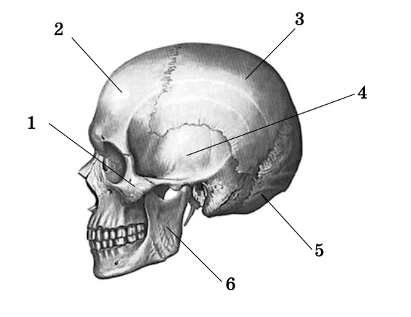 Выберите три верно обозначенные подписи к рисунку, на котором изображён череп человека. Запишите в таблицу цифры, под которыми они указаны.