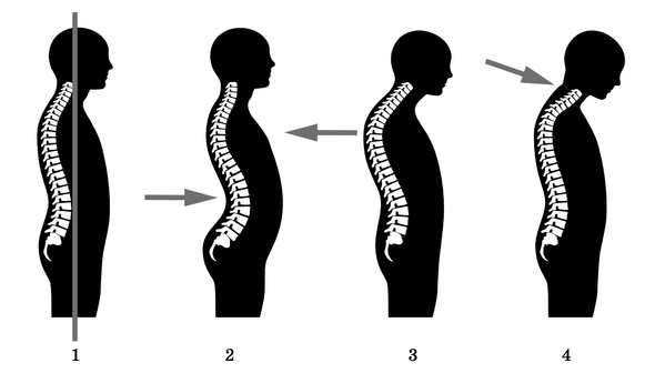 Рассмотрите рисунки 1—4 с изображением типов осанки человека. Как называют нарушение осанки, изображённое на рисунке 2? Назовите одну из причин появления такого заболевания у человека.