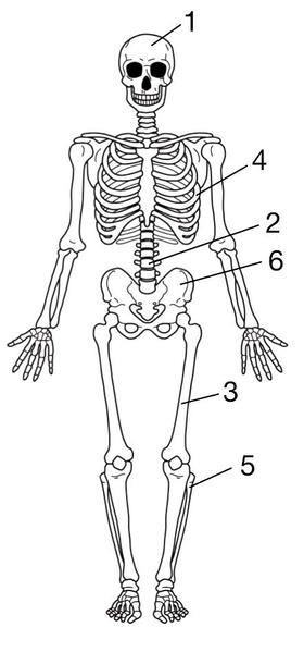 Выберите три верно обозначенные подписи к рисунку, на котором изображено строение скелета человека. Запишите в таблицу цифры, под которыми они указаны.