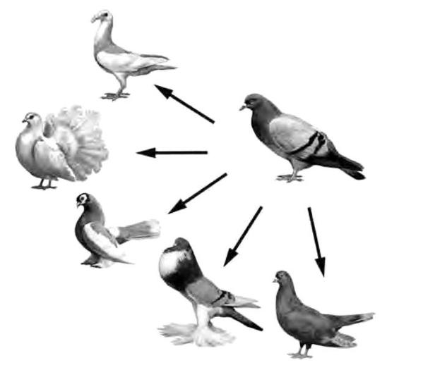 На рисунке изображён сизый голубь и полученные от него путём продолжительных скрещиваний и отбора породы домашних голубей.