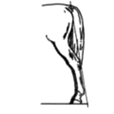 Г. Постановка задних конечностей в положении стоя на ноге, расположенной дальше от корпуса (относительно линии, соединяющей крайнюю точку задней поверхности седалищного и пяточного бугров)