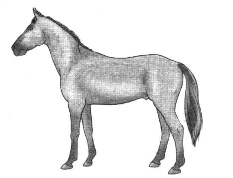 Рассмотрите изображение лошади. Выберите характеристики, соответствующие её внешнему строению, по следующему плану: постановка головы, форма головы, форма спины, постановка задних конечностей.